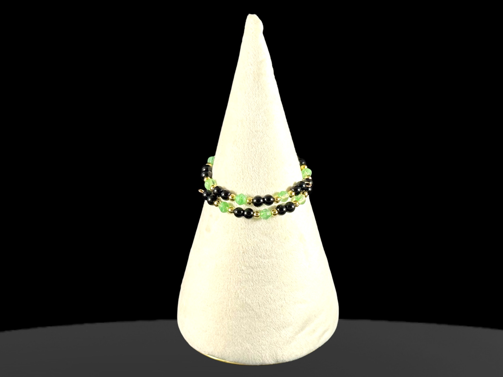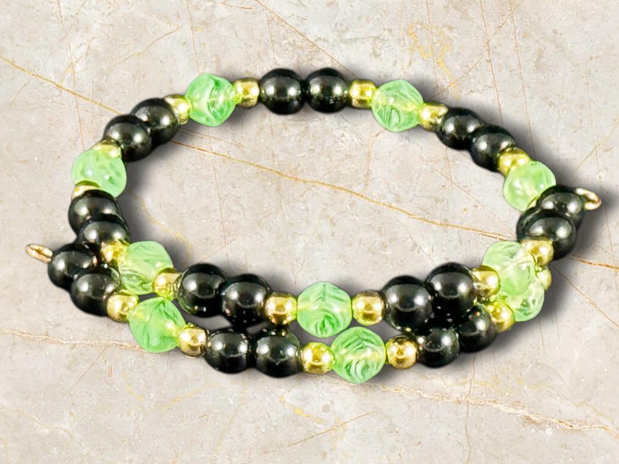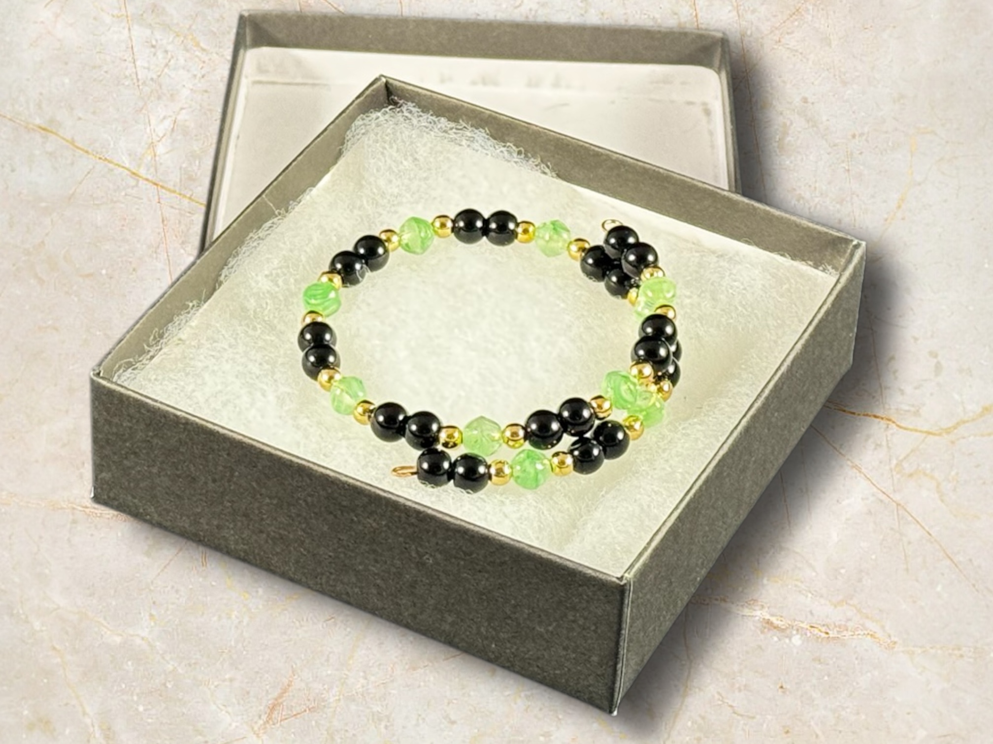 Dark, cunning, and fiercely elegant, this bracelet channels the essence of a shadowy wyrm lurking in misty swamps. With polished black onyx, acid-green glass beads, and gleaming 14K gold-plated accents, it evokes a clever and ruthless creature of legend. A powerful accessory for those drawn to mystery and strength.