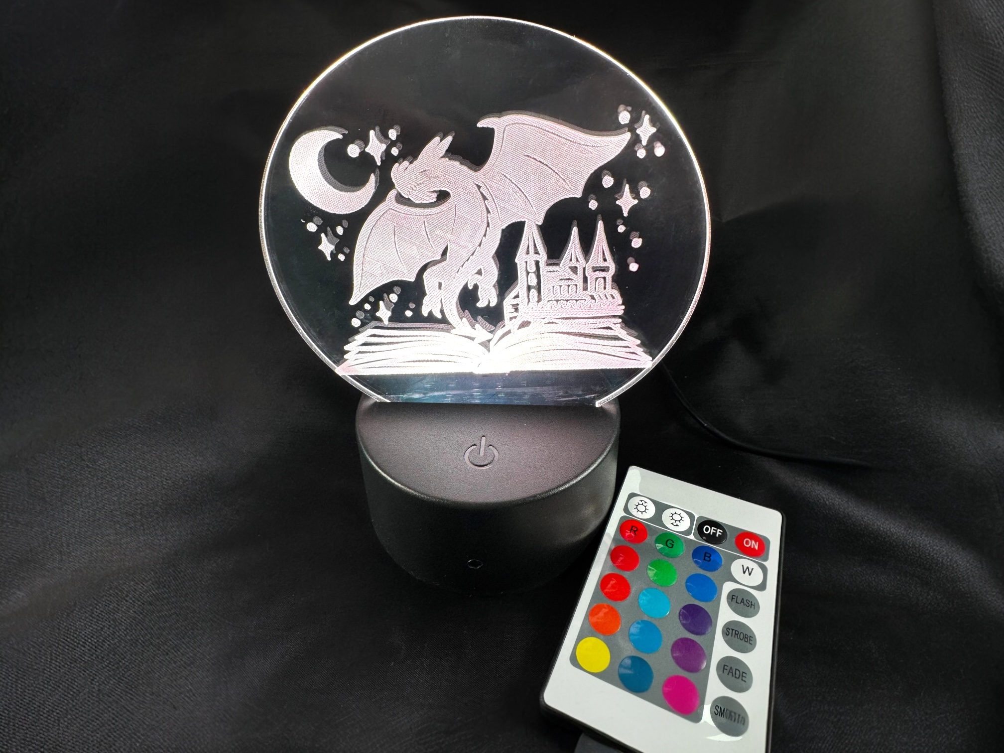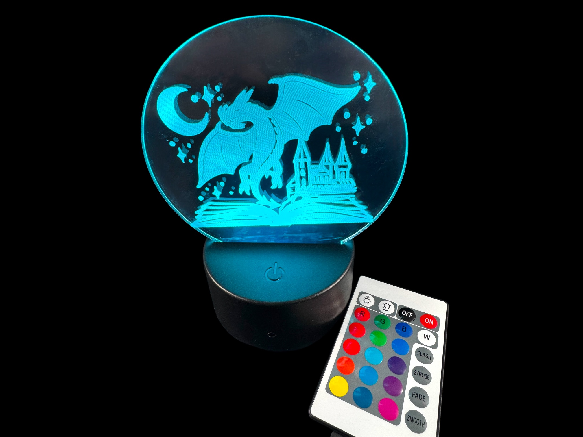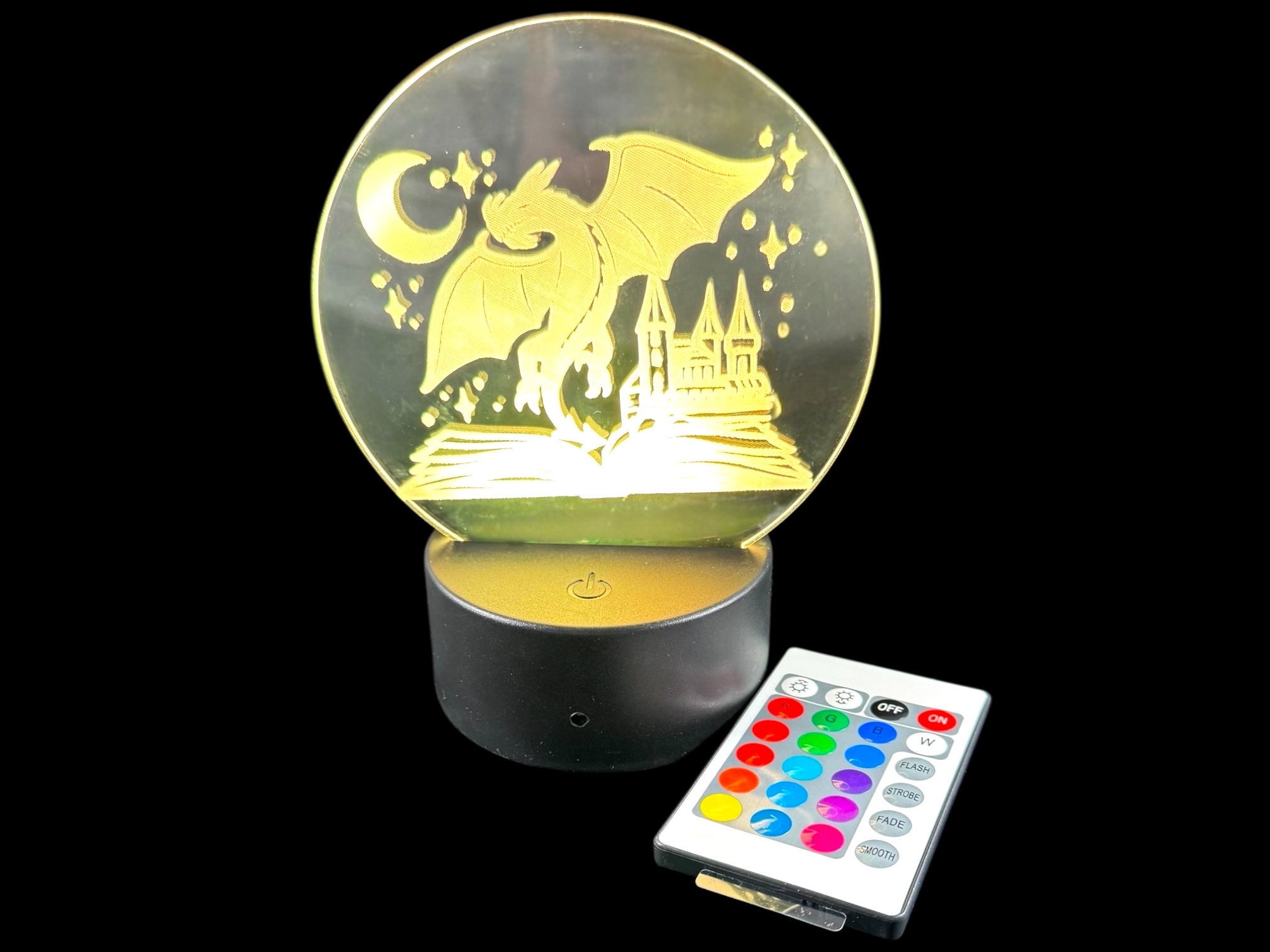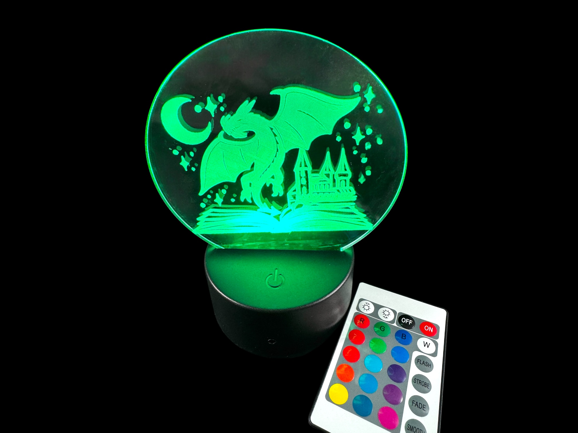 Bring a touch of magic to your space with this fantasy-inspired color-changing LED light, featuring an engraved design of a dragon, an open book, and a castle. Perfect for book lovers, fantasy fans, and dreamers of all ages, this glowing display adds a cozy, enchanted vibe to any room.