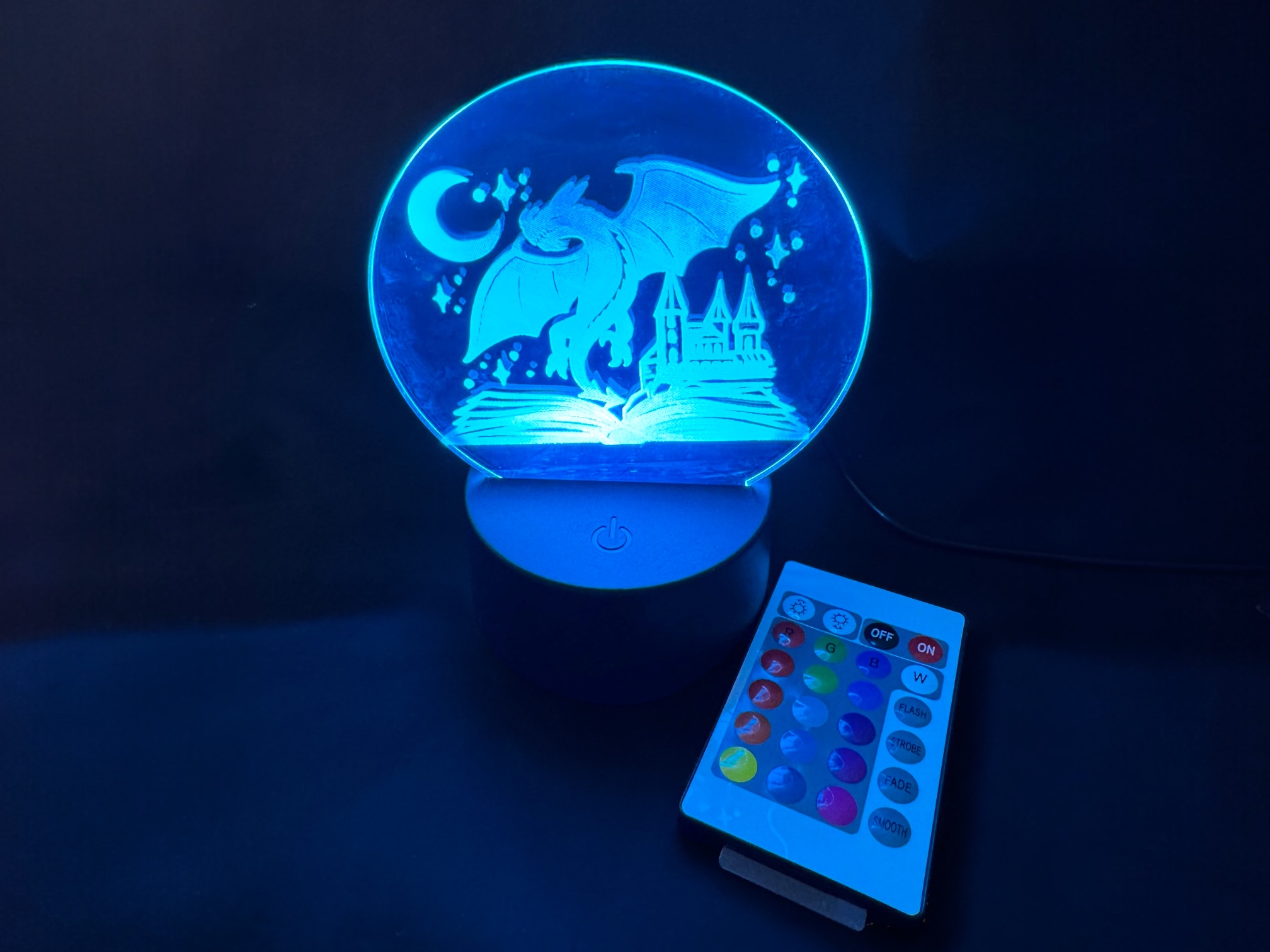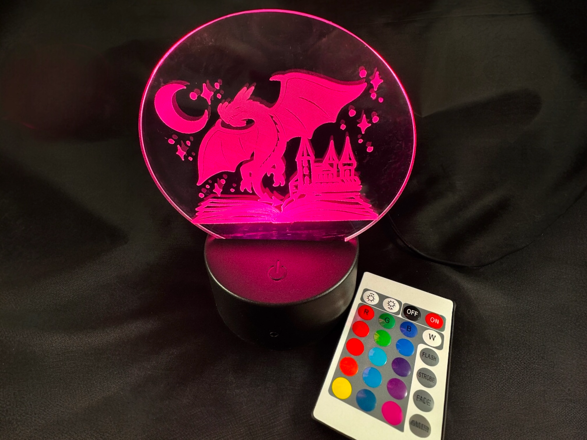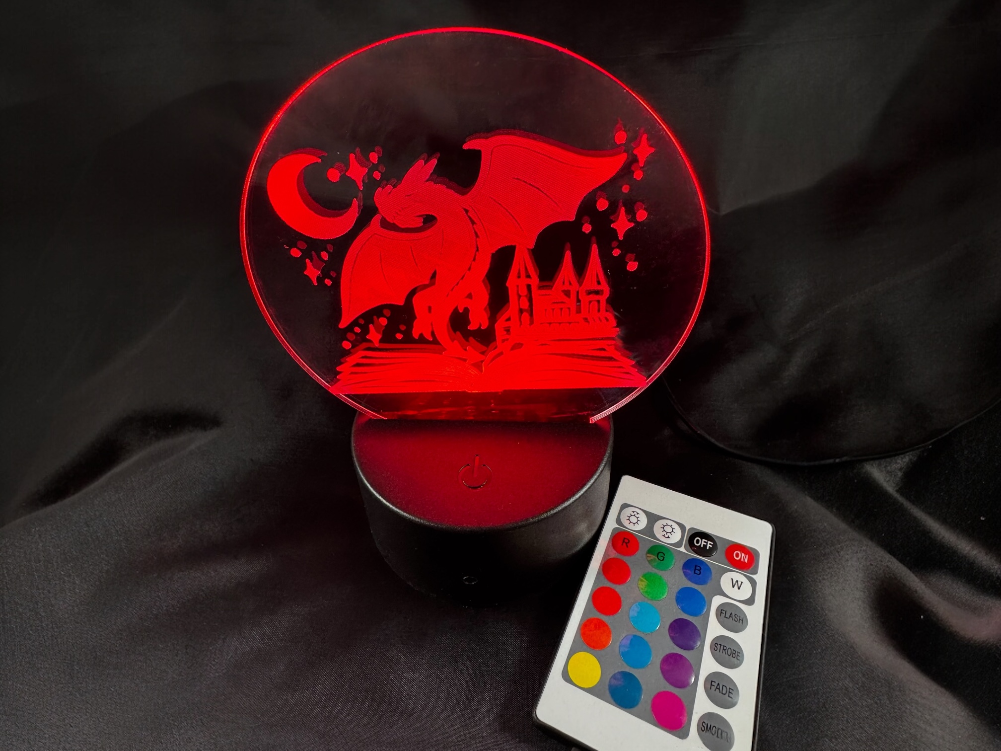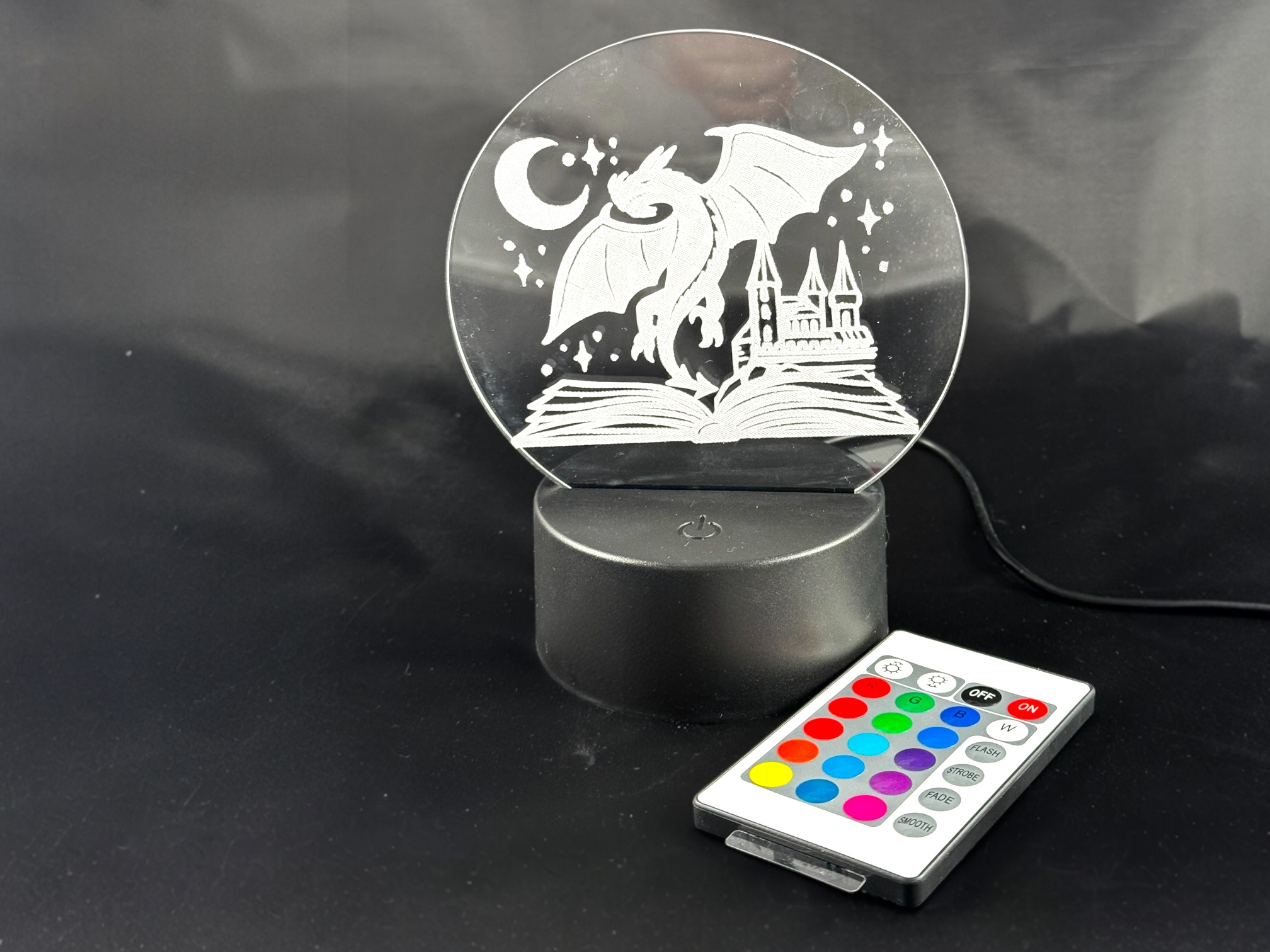 Bring a touch of magic to your space with this fantasy-inspired color-changing LED light, featuring an engraved design of a dragon, an open book, and a castle. Perfect for book lovers, fantasy fans, and dreamers of all ages, this glowing display adds a cozy, enchanted vibe to any room.