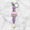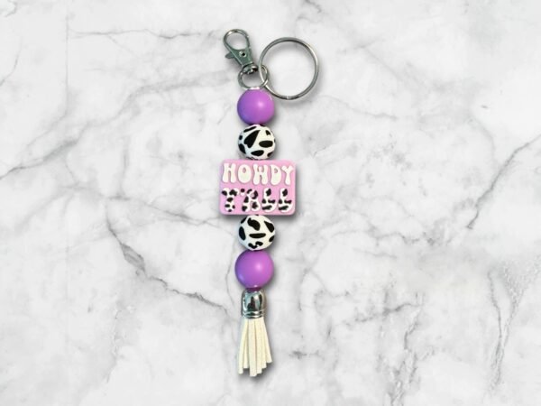 Give your keys, backpack, or purse a stylish makeover with this silicone beaded keychain. It features a silver keychain and a lobster clasp, adorned with purple and cowprint silicone beads and a silicone focal bead (Howdy Y’ALL). It’s finished off with a white tassel.