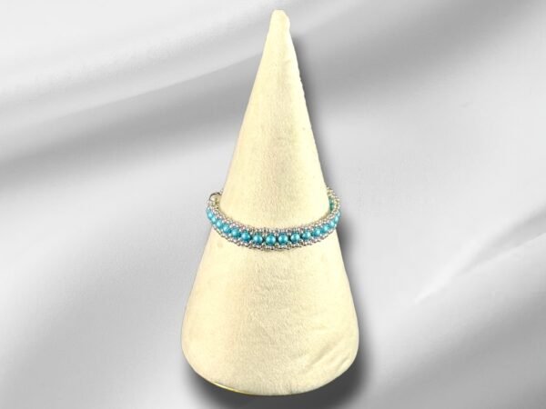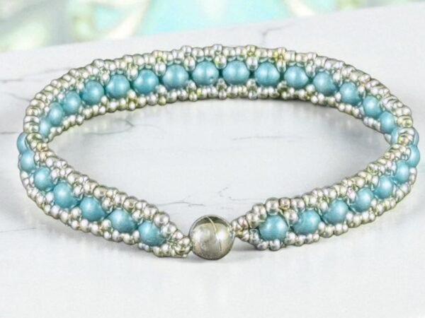 The metallic aqua RounDuo beads offer a smooth, domed finish that complements the fine detailing of the seed beads. A magnetic clasp provides easy, secure fastening, making this bracelet both stylish and practical.