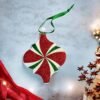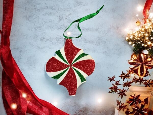 Add some sparkle to your Christmas tree with this glittery peppermint swirl ceramic tile ornament. It has soft white felt covering the back and a green ribbon tie for easy hanging on your tree.