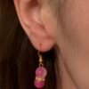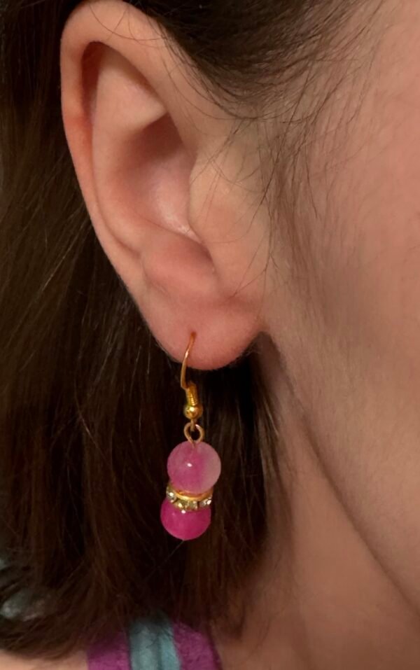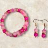 Enhance your personal style with set of matching shades of pink bracelet and earrings. Crafted from 8mm glass beads interspersed with faux crystal rhinestone rondelles, the bracelet is made from nearly 1.5 loops of 2.25-inch diameter gold memory wire. The picture shows it on a 5.5 inch wrist, but it is flexible enough to fit on a 7 inch wrist as well.