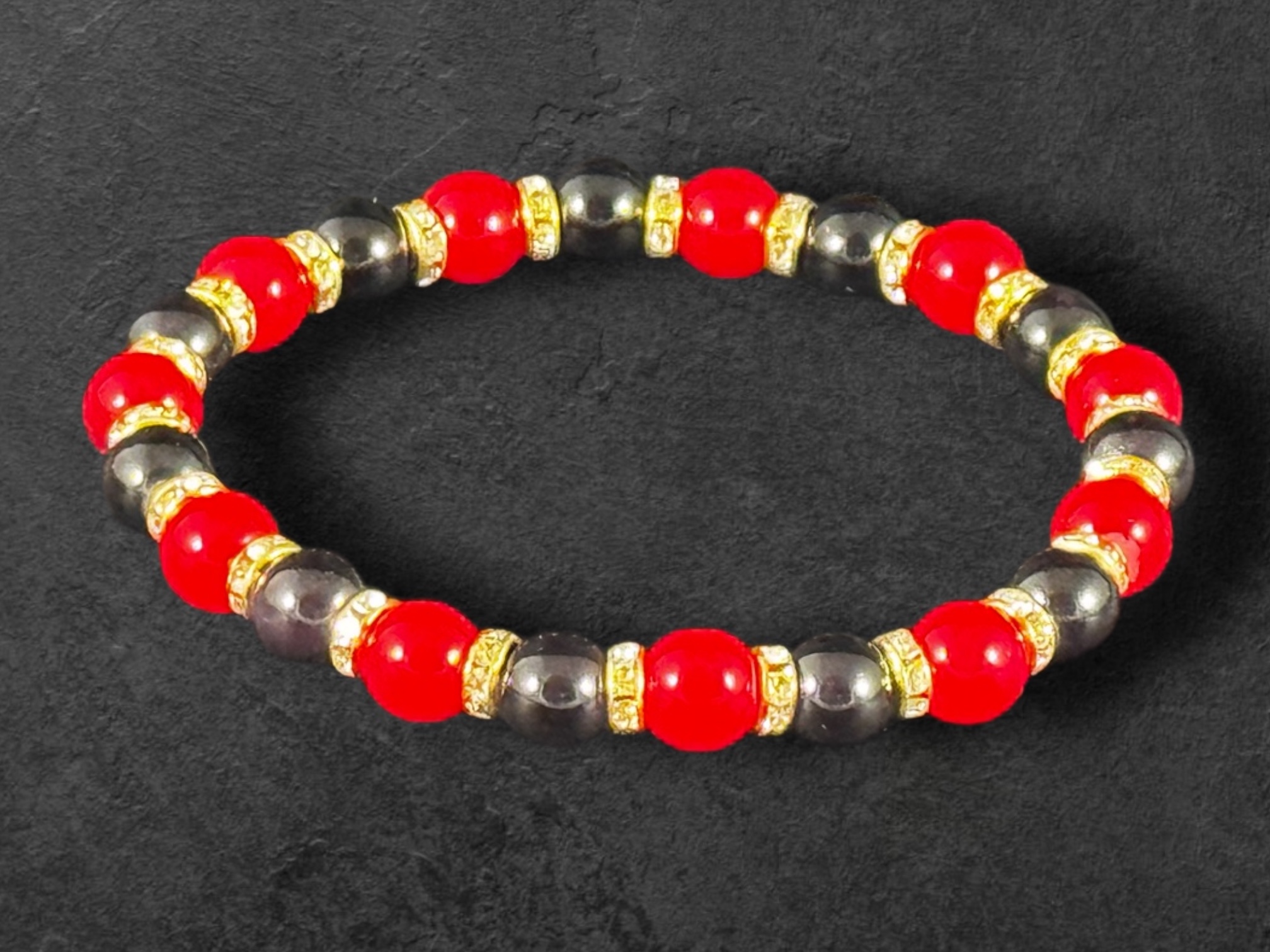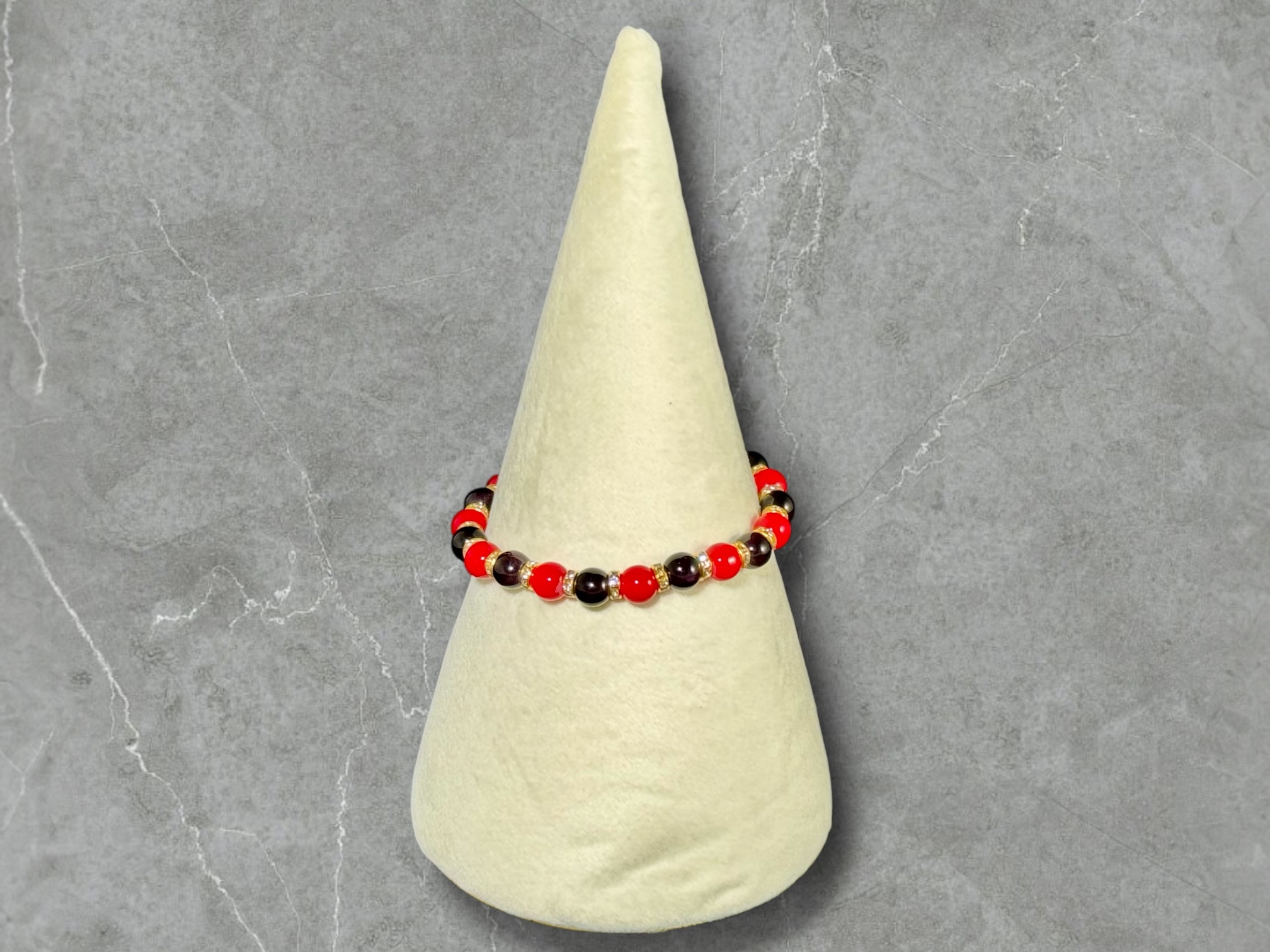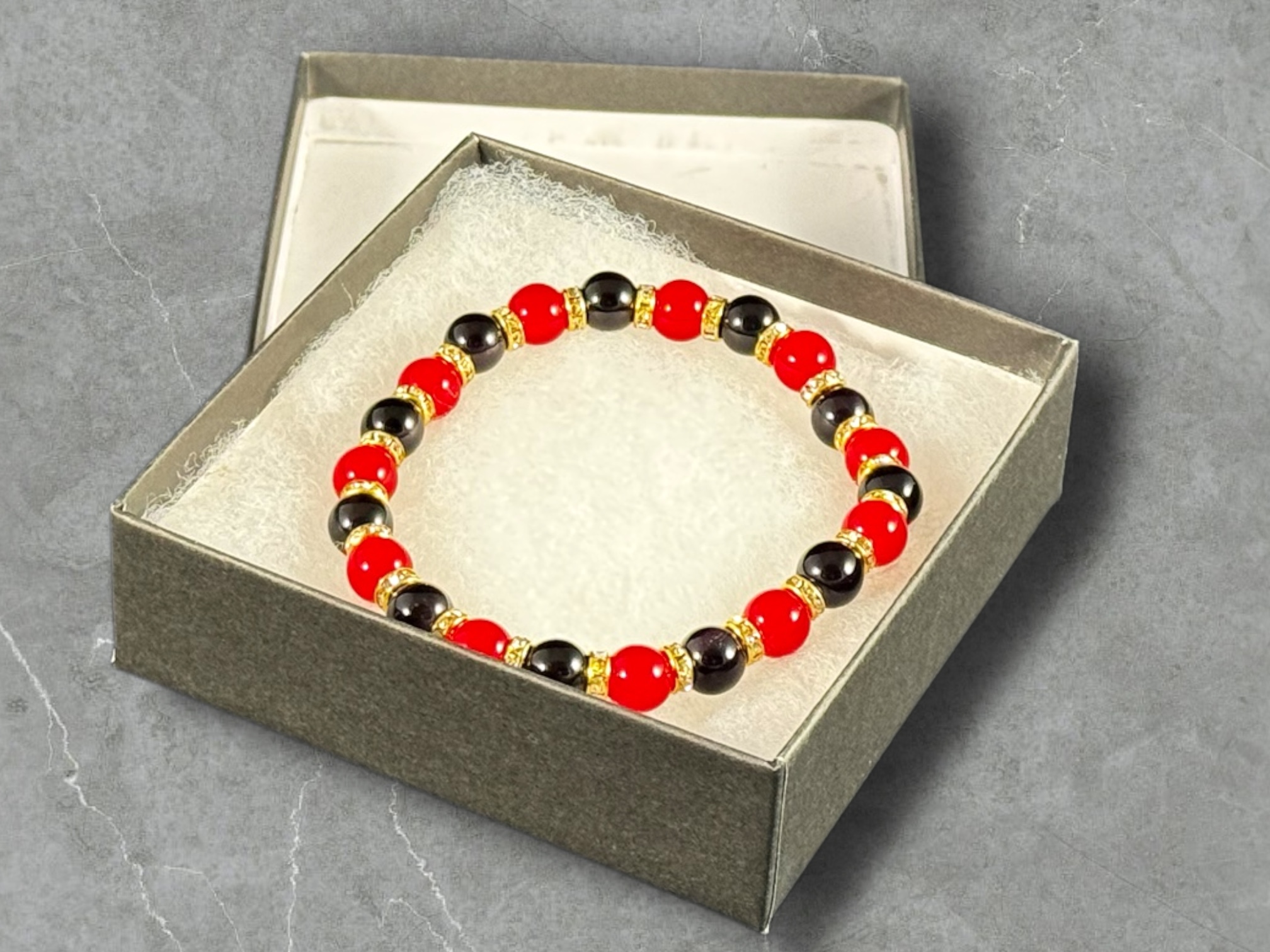 Add a touch of drama and glam to your wrist with this striking stretch bracelet, featuring 8 mm deep red and black glass beads paired with dazzling gold crystal rhinestone spacers. The vibrant colors and shimmering accents create a bold, luxurious look—perfect for elevating everyday outfits or making a statement on a night out. Designed on an elastic clear cord for easy wear and a perfect fit.