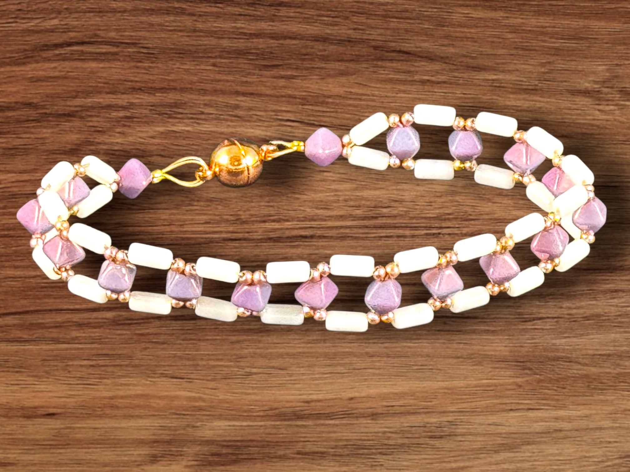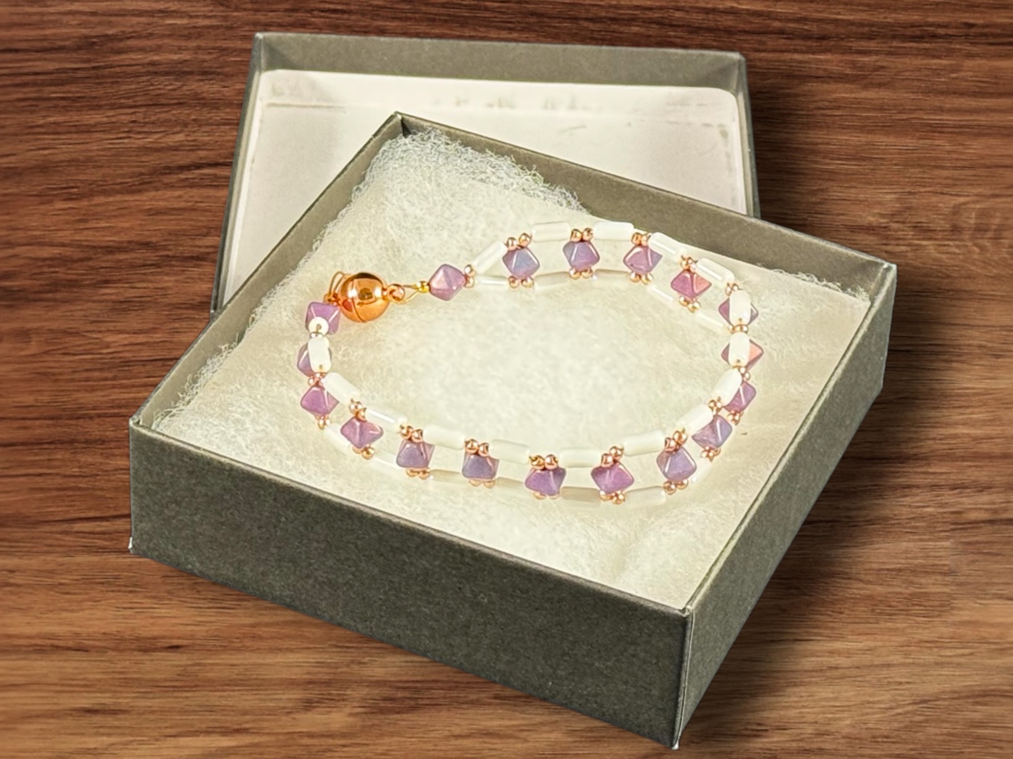 Add a touch of elegance to your everyday look with this handmade bracelet. It features a blend of white shimmer tubelet beads, white luster purple bicone beads, and delicate gold seed beads. The rose gold magnetic clasp ensures secure wear, making this bracelet a stunning piece on its own or layered with your favorite accessories.