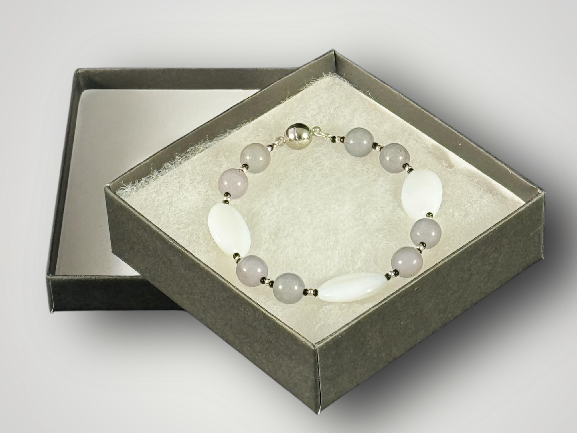 This 6.5-inch bracelet features a secure silver magnetic clasp that allows for effortless wear. The combination of soft white, smokey gray, deep black, and silver accents creates a balanced and polished finish.