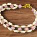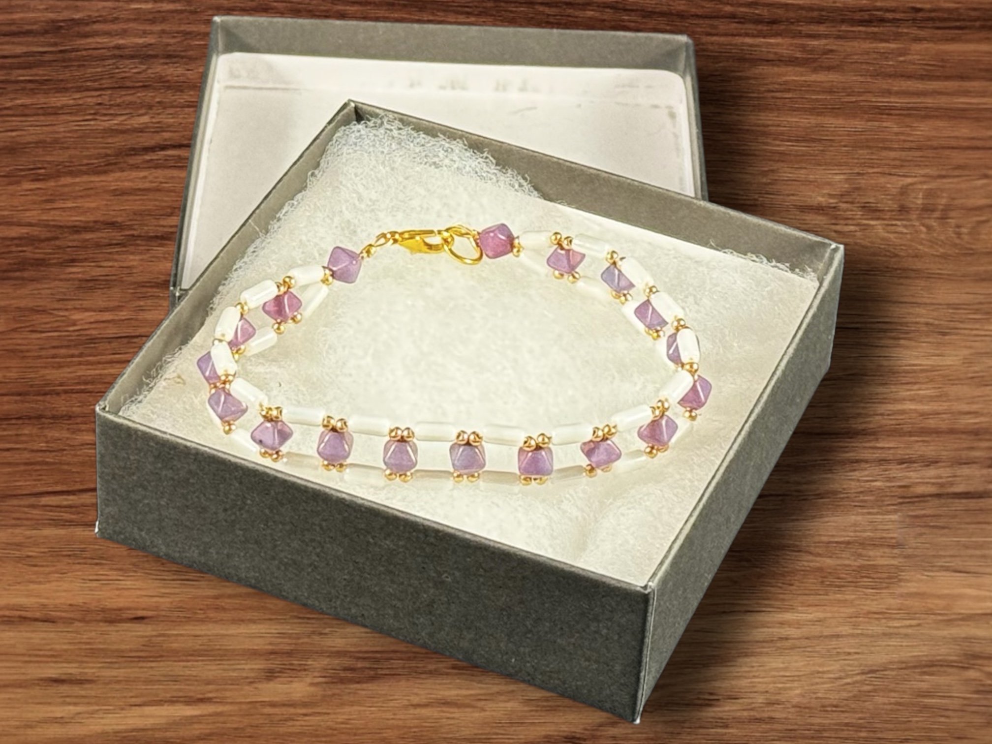 Add a touch of elegance to your everyday look with this handmade bracelet. It features a blend of white shimmer tubelet beads, white luster purple bicone beads, and delicate gold seed beads. The gold lobster clasp ensures secure wear, making this bracelet a stunning piece on its own or layered with your favorite accessories.